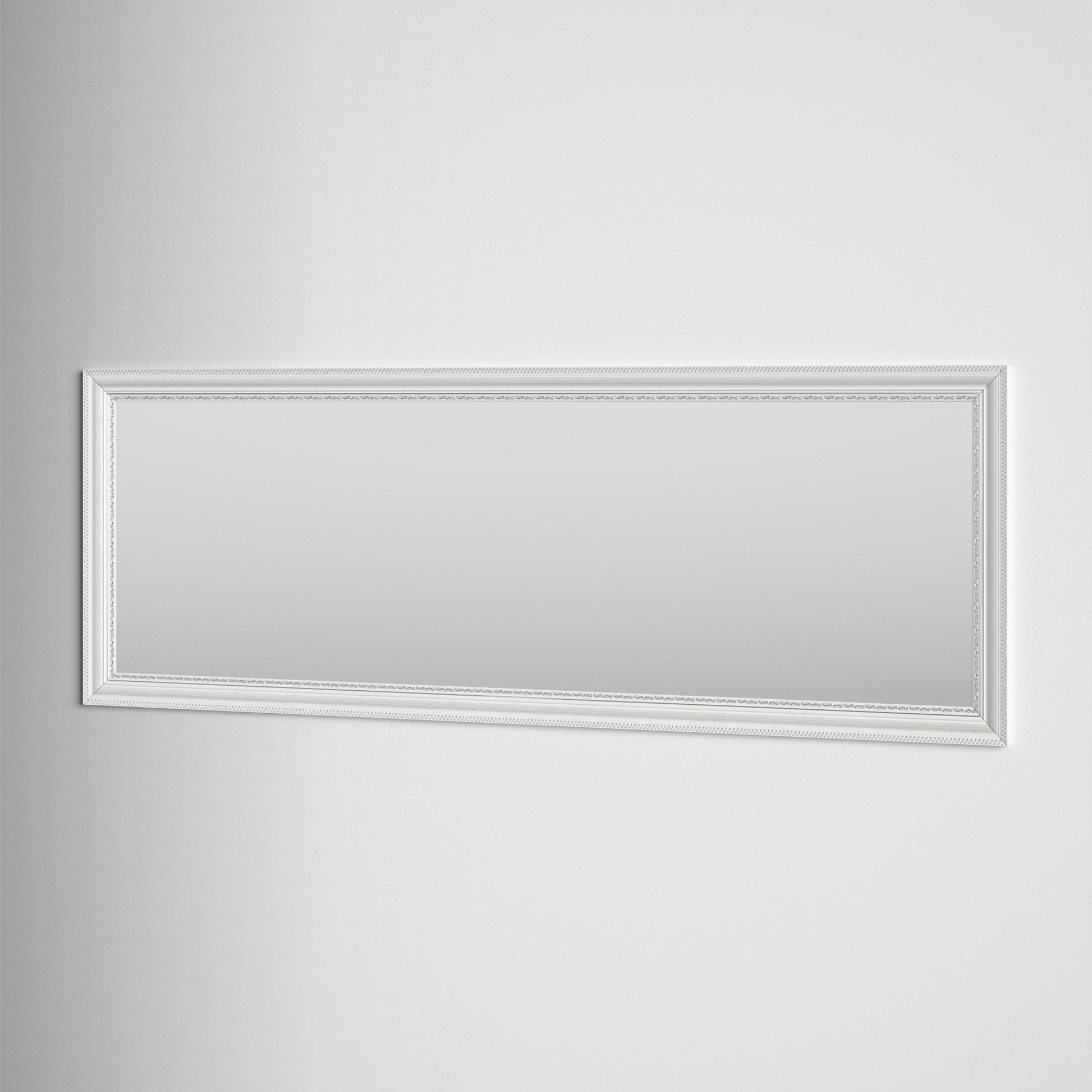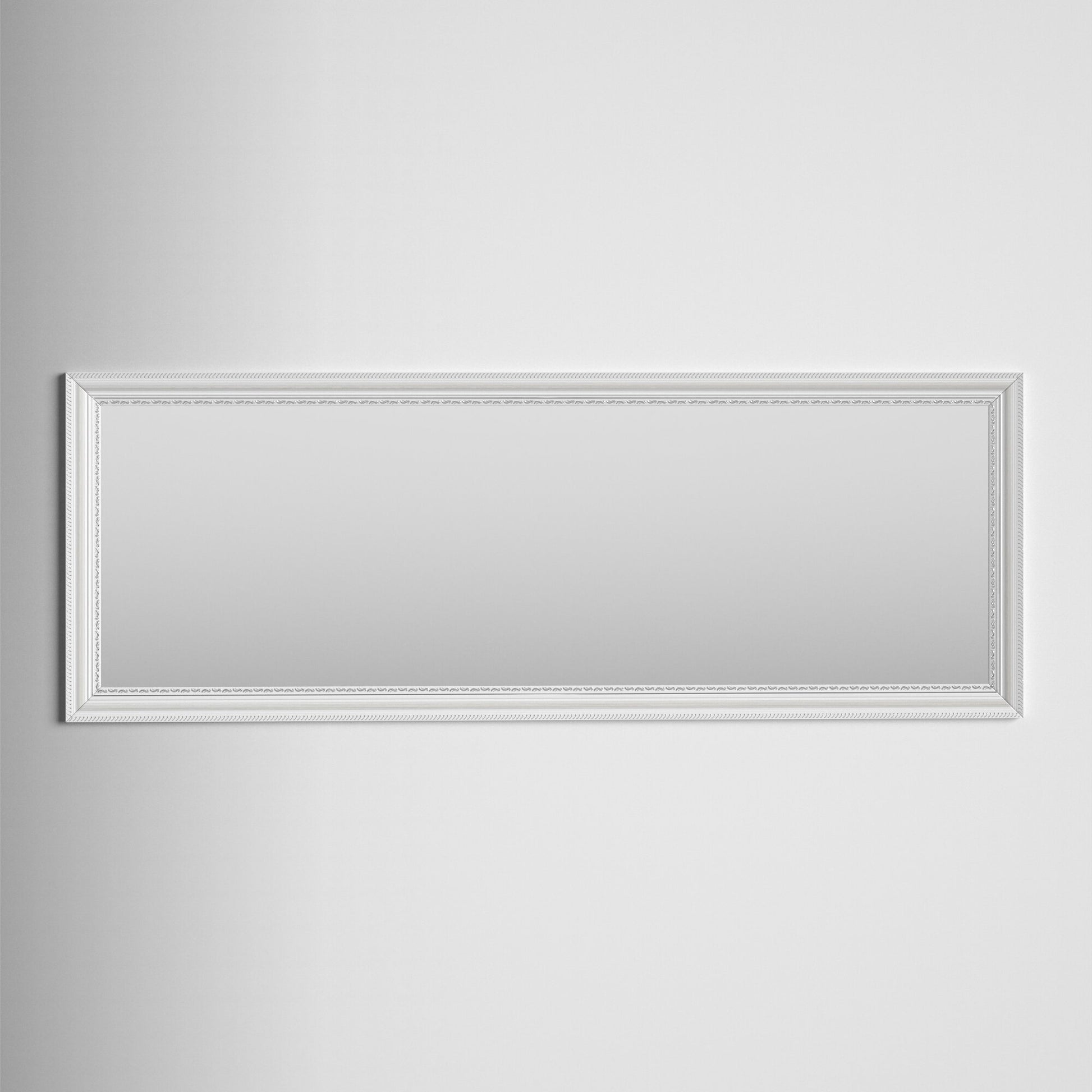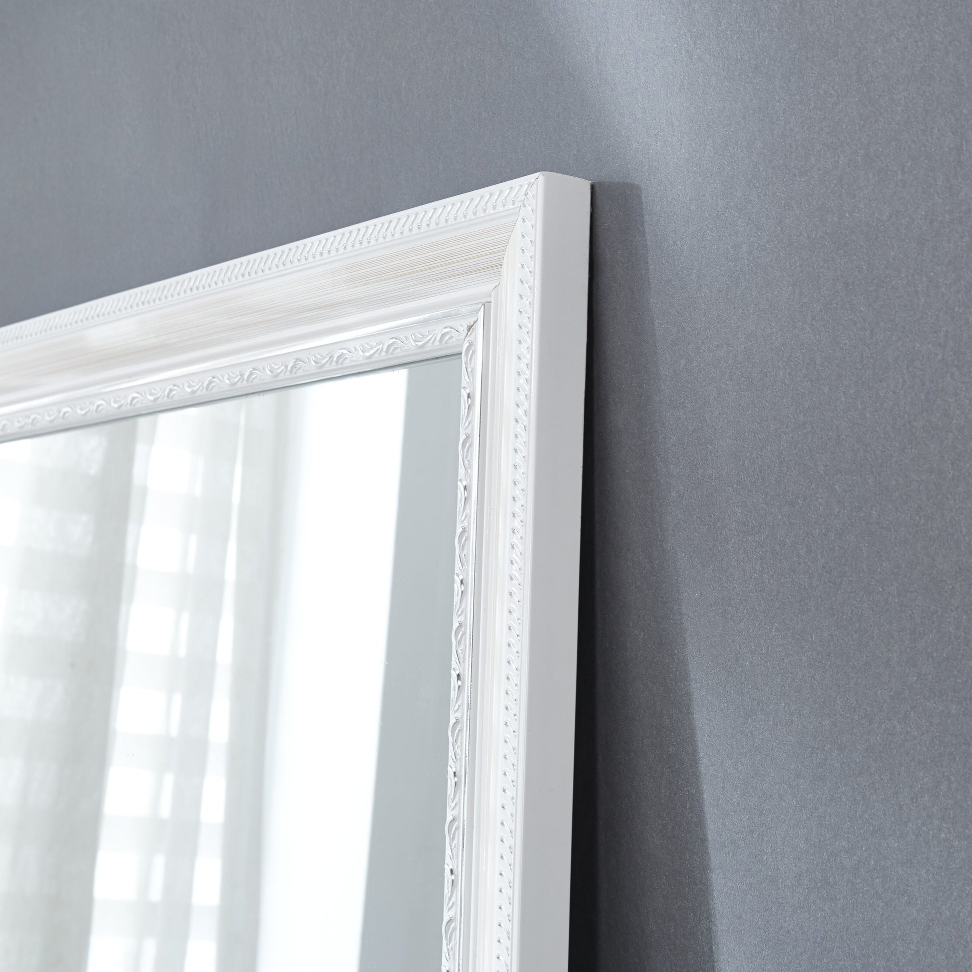This full-length mirror adds just the right amount of French country charm to your bedroom or entryway. It has a white wooden frame that's decorated with a trim of subtle scrolling florals and diagonal stripes. And it's beveled edge has distressed details for a vintage element. The mirrored glass has a non-beveled edge for a clean-lined reflection before you head out for the day. We love how this mirror can be installed vertically or horizontally, so you can make it work for your space. Or you can lean it against your wall for a relaxed look.